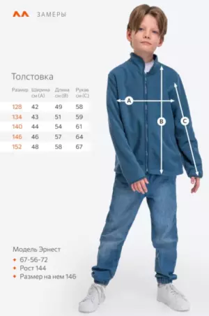 Модель Эрнест, рост 144 см, параметры 65-59-69 см, на нем размер 146.