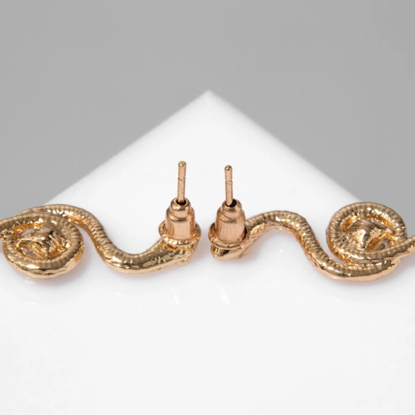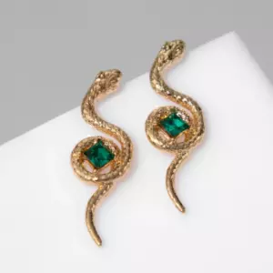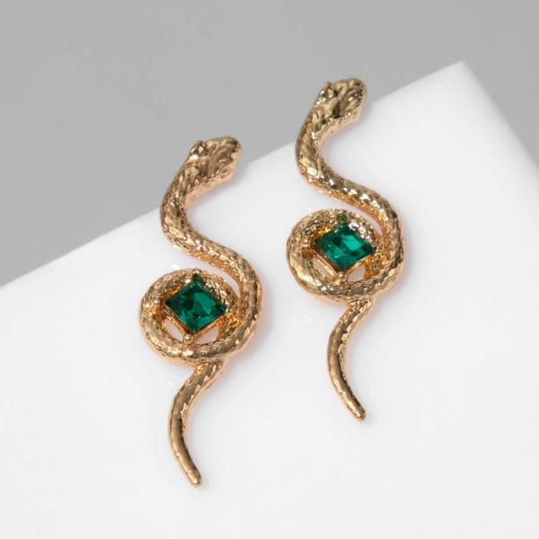 Серьги со стразами «Змея» завиток, цвет зелёный в золоте