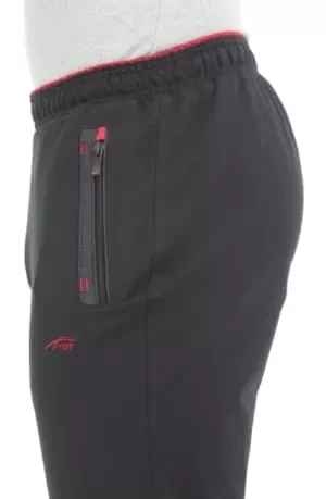 Трикотажные брюки с 2-х цветным поясом на резинке. Для дополнительной фиксации в пояс с внутренней стороны вставлен шнурок. Брючины заужены книзу. Вертикальные передние карманы фиксируются молниями. Завершители молний выполнены из цветной плащёвки. Входы в карманы отделаны плащёвкой в тон основного материала, декорированы отделочными строчками, вышивкой и цветными закрепками. Под левым карманом вышивка в фирменном стиле. Задний карман на молнии под листочкой. Дизайн отделки листочки аналогичен оформлению передних карманов.
