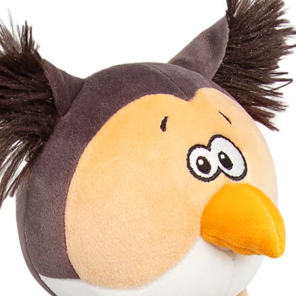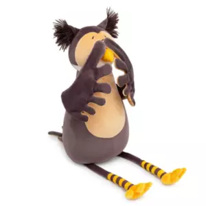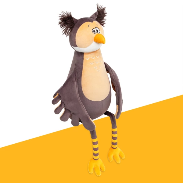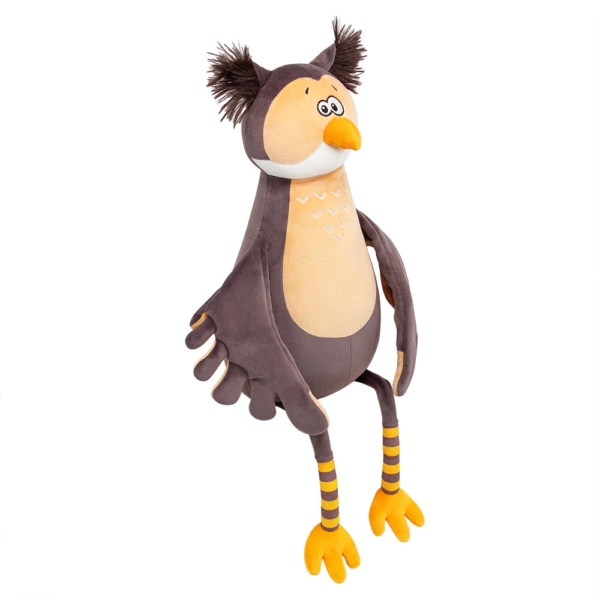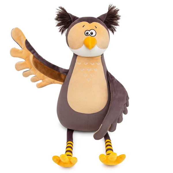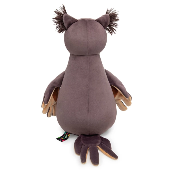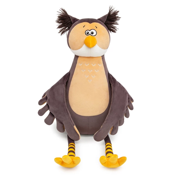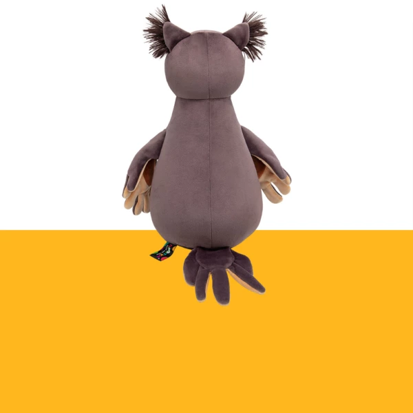 Сова Ула сложного коричневого цвета имбирного печенья, белой и кремово-бежевой вставкой на мордочке, аккуратным клювом золотистого цвета и кремово-бежевой грудкой с элегантной вышивкой. Размашистые крылья составные и сшиты в цветах специй – кремово-бежевого и коричневого. Длинные ножки Улы будто в полосатых носочках коричневого и золотисто-жёлтого цветов. В ушках совы эффектный длинный тёмно-коричневый мех, а сонные глазки вышиты чёрно-белыми шелковистыми нитками. У Улы в крыльях и глазах спрятаны магниты, что позволяет ей закрывать глаза себе, другу из коллекции Прятки, соединять свои крылья, а также притягиваться к лапкам друзей!