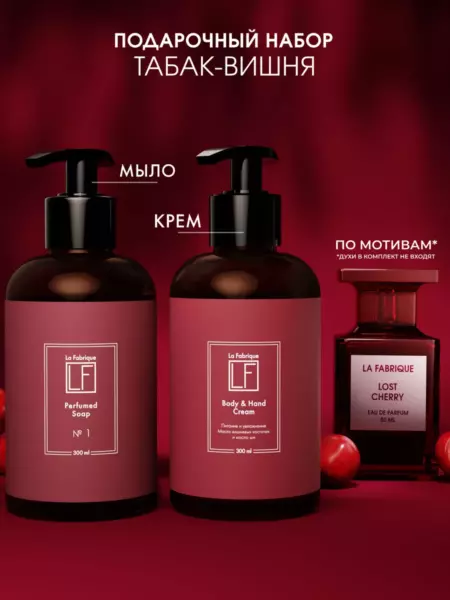 В парфюмированный набор входит мыло и крем с пряным ароматом вишни и табака. Они подарят коже бережное очищение, увлажнение и питание. Мыло мягко очищает и подходит даже для самой чувствительной кожи, не сушит и не стягивает, не допускает появления шелушений и дряблости. В его составе исключительно натуральные гипоаллергенные компоненты: масло авокадо, миндальное масло, экстракт женьшеня, алоэ вера, витамины Е и В.
