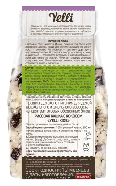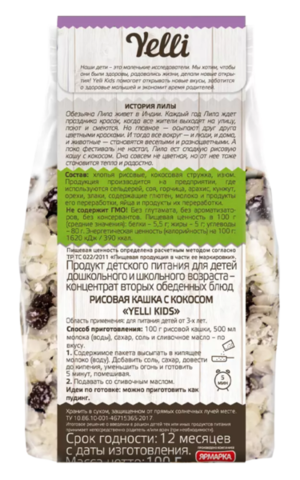 Кашка рисовая с кокосом 100гр 1/9 "Yelli kids"