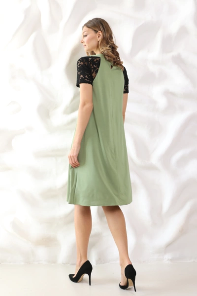 Платье А-силуэта с круглой горловиной и застёжкой на пуговицы.Короткий рукав реглан из кружева.