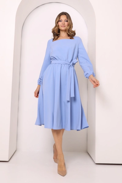 Платье с юбкой полусолнце и поясом в комплекте. Резинка по линии талии. Вырез-трапеция. Длинный рукав с резинкой по манжете.