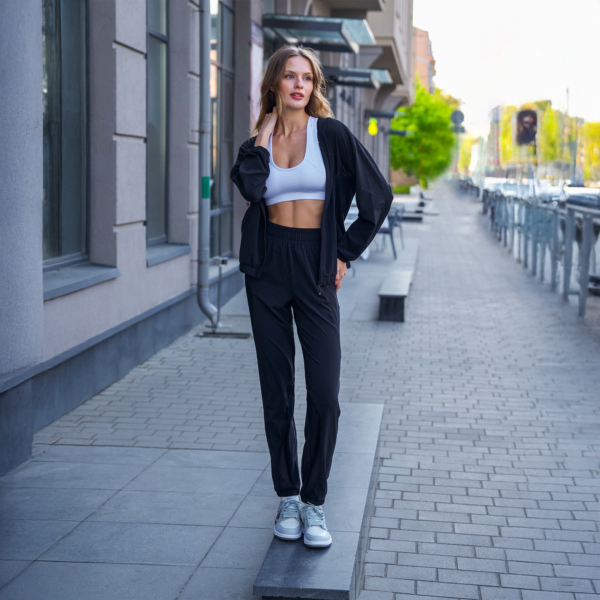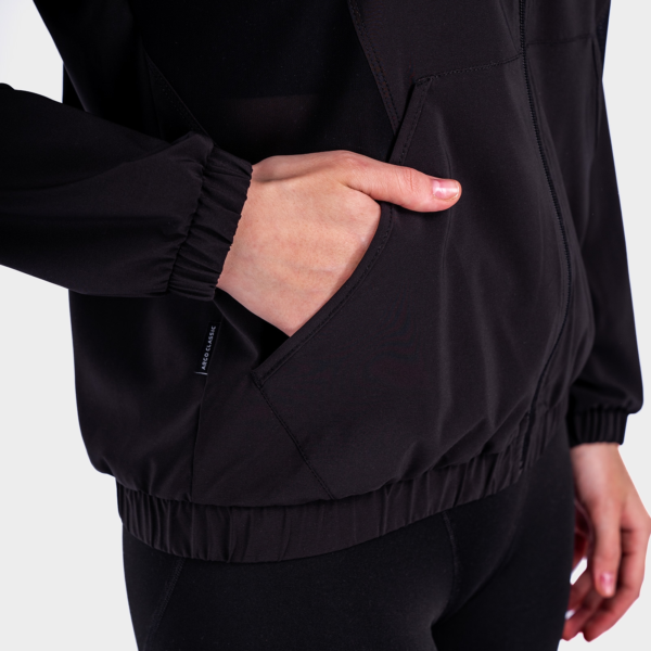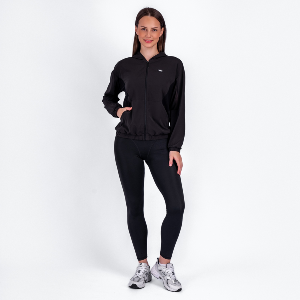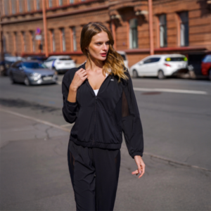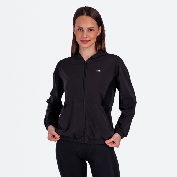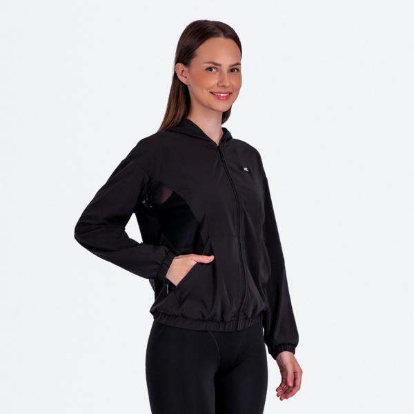 Женская куртка с капюшоном, карманами и вставками из сетки.