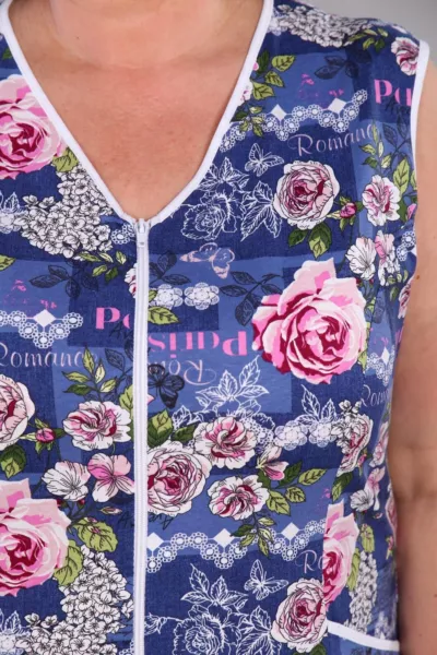 Женский халат выполнен из трикотажного полотна "кулирка-купон". Летний лёгкий халат на молнии, без рукавов, на боковых рельефах переда находятся настрочные карманы, горловина,вход в карманы и проймы обработаны бейкой контрастного цвета._x000D_