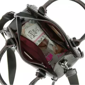 Внутри сумки: одно большое отделение. На боковых стенках имеются карманы: два открытых и два на молнии для телефона, документов и мелочей. С внешней стороны на задней стенке карман на молнии. Сумка отлично держит форму. В комплекте удлиненный кожаный ремень, регулируемый по длине, и ремень из высокопрочного текстиля. На дне расположены металлические ножки, предохраняющие от повреждений. Сумка закрывается на молнию.