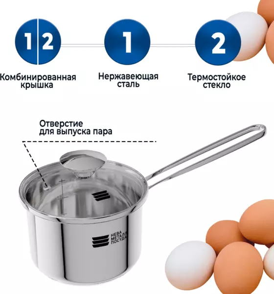 Комбинированная крышка из нержавеющей стали и термостойкого стекла с отверстием для выпуска пара.