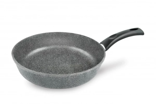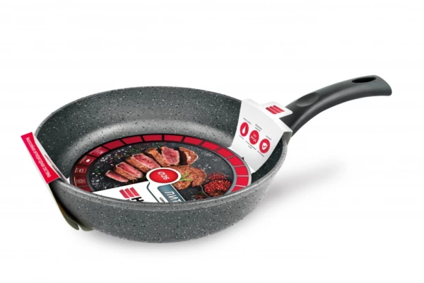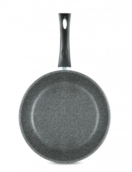 Универсальная сковорода с покрытием с эффектом натурального камня - "серый гранит". Цвет органично сочетается с интерьером кухни и помогает долго сохранять прекрасный внешним вид сковороды.