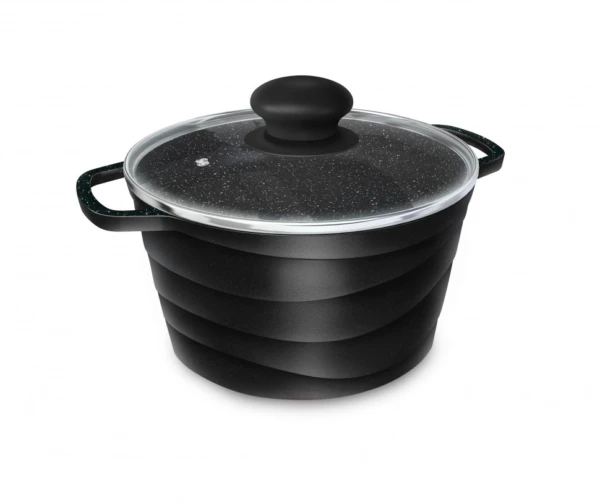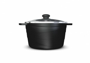 Кастрюля имеет современный прямой корпус из литого алюминия с уникальным геометрическим рисунком «волна».
