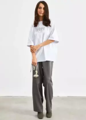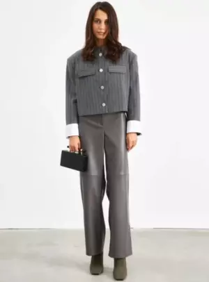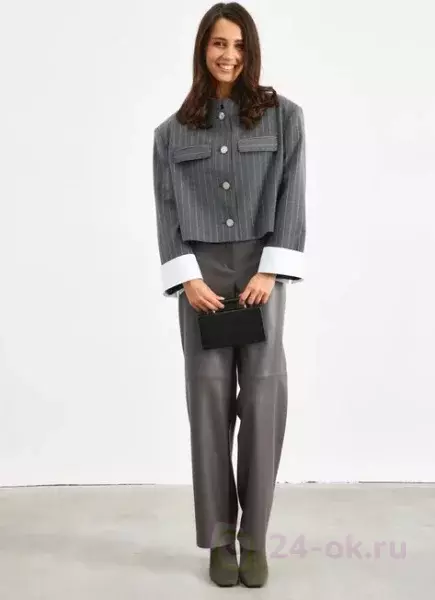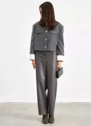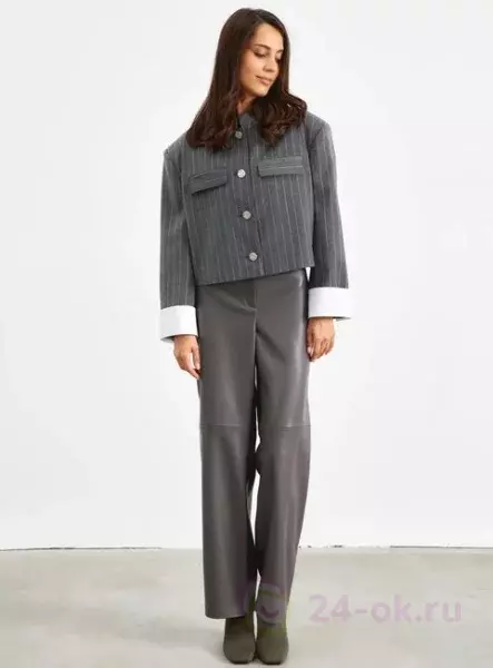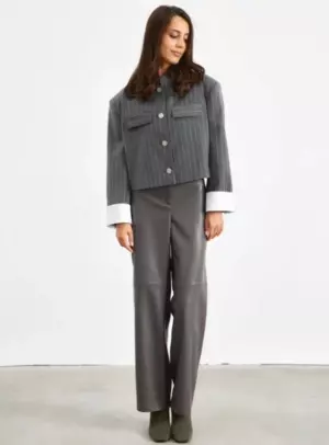 | Брюки прямого кроя, выполнены из экокожи в в глубоком сером цвете. Брюки на стабильном поясе, по переду застежка на молнию и пуговицу. По бокам изделия карманы. Состав ПЭ 97%, эластан 3% |