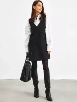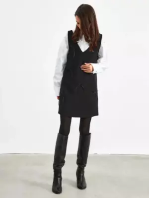 Платье в длине мини, с v-образным вырезом. Платье из костюмно-плательной ткани, по переду стилизовано аккуратными бантиками. Состав вискоза 80%, полиэстер 18%, эластан 2% |
