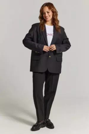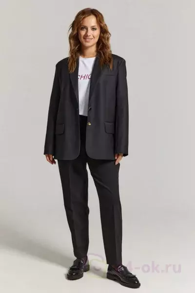 Жакет прямого свободного кроя выполнен из костюмного полотна в черном цвете. Жакет на подкладке, застежка центральная на две акцентные пуговицы, по переду прорезные функциональные карманы с клапаном, рукав втачной со шлицей и пуговицами.