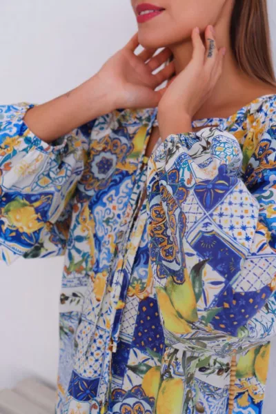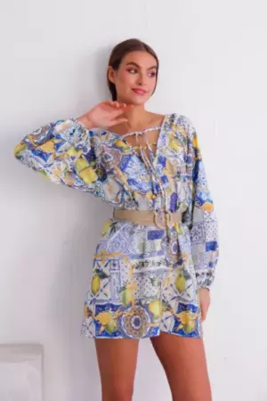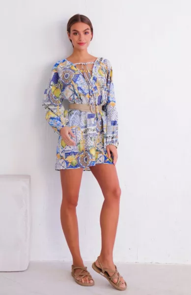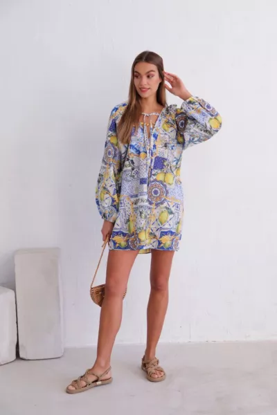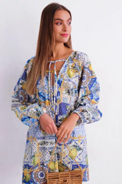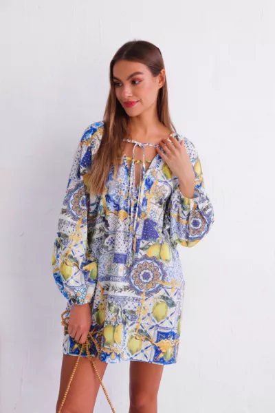 Короткое хлопковое платье с летним принтом можно носить и в качестве пляжной туники. Платье с цельнокроенными широкими рукавами, собранными внизу на бейку. По спинке и по переду - V-образный вырез с завязками.