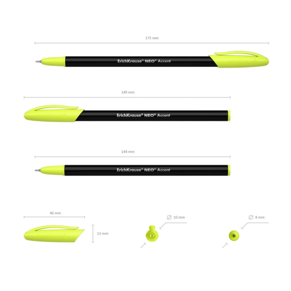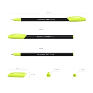 - Ручка имеет матовый непрозрачный круглый корпус черного цвета и вентилируемый колпачок яркого неонового цвета.