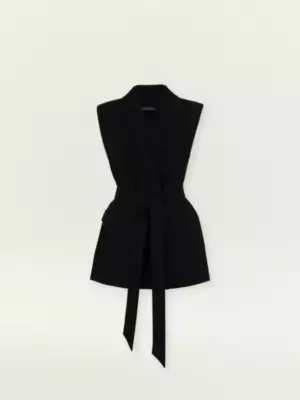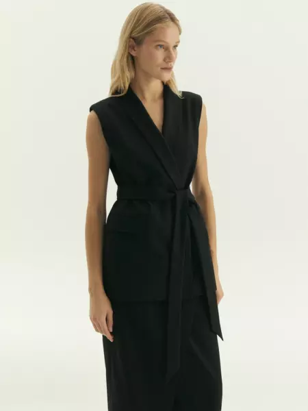 Жилет для деловых и кэжуальных образов на каждый день. Стильная модель имеет шалевый воротник и карманы с клапанами. Застёгивается на две потайные пуговицы и дополнен поясом, который можно завязать разными способами по вкусу. Жилет сделан из приятной костюмной ткани, на подкладке с вискозой. Может стать частью большой капсулы с жакетами, брюками и юбками monk. Цвет: черный Силуэт: приталенный Сезон: мульти Застёжка: пуговицы Подкладка: 55% полиэстер, 45% вискоза Рост модели: 175-178 См 69% полиэстер, 29% вискоза, 2% эластан