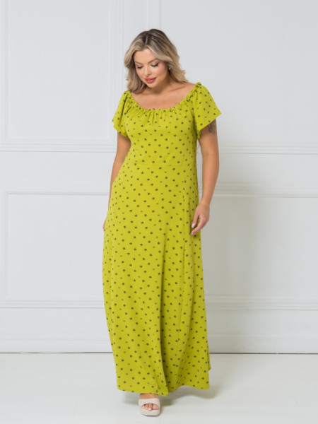 Повседневное платья в стиле «Кантри» длиной макси, выполнено из тонкой плательной ткани с эффектом крэш. Платье отрезное по линии талии. Верх переда платья целый. Спинка с отрезными бочками. В швах притачивания бочков воздушные петли со шнуровкой, позволяющей регулировать свободу прилегания по фигуре. Рукав-реглан короткий. Длина рукава от горловины в 48 р-ре – 19 см. в 62 р-ре – 22 см., ширина рукава по низу в 48 р-ре – 51 см. в 62 р-ре – 60 см. Горловина со сборкой на резину, что позволяет носить платье с открытыми плечами. Юбка 4-х клинка слегка расклешенная к низу. Платье без застежек и подклада. Длина изделия по спинке в 48 р-ре – 128 см. в 62 р-ре – 134 см.