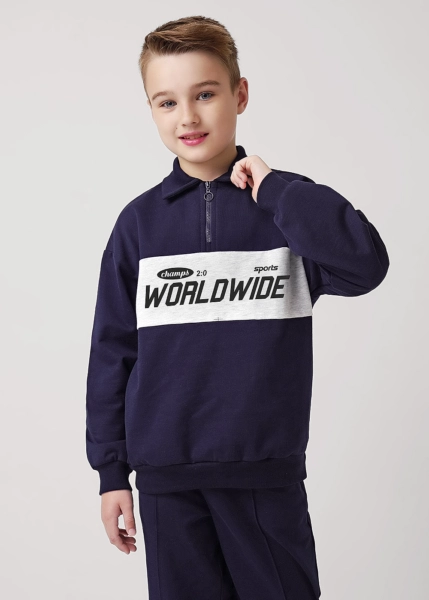 Стильный джемпер в стиле колорблок- то, что нужно для создания классного образа и отличного настроения! Модель из мягкого футера дополнена короткой молнией и контрастной вставкой с принтом. Воротник и манжеты выполнены из эластичного трикотажа. 100% хлопок
