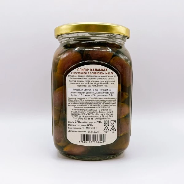 Оливки сорта Каламата с косточкой, оливковое масло (Extra Virgin Olive Oil), соль, кориандр.