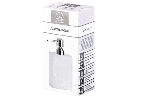 Настольный диспенсер от Elan Gallery подойдёт для хранения жидких моющих и очищающих средств. Размер изделия – 8х6х17,5 см, объём – 300 мл. Высота без дозатора – 13 см. Выполнен из полирезина – современного материала, отличающегося лёгкостью и устойчивостью к влаге. Он не выделяет вредных веществ и не впитывает посторонние запахи. Благодаря высокой прочности изделие надолго сохранит привлекательный внешний вид. Белая поверхность имеет мраморный эффект. Дозатор серебристого цвета выполнен из пластика. Он герметичен и надёжно предотвращает проливание. Благодаря красивому дизайну и необычной форме баночка найдёт место в любой части вашей квартиры. Заполните ёмкость жидким мылом или средством для посуды и расположите на кухонной раковине. В ванной используйте флакон под гель для душа или шампунь. Универсальную бутылочку можно приспособить под антисептик. Поставьте её на рабочий стол в своей комнате или кабинете, чтобы дезинфицирующее средство было под рукой. Не рекомендуется применять абразивные моющие средства. Не подходит для использования в посудомоечной машине. Для очистки изделия воспользуйтесь тёплой водой с добавлением моющего средства. Поставляется в дизайнерской картонной коробке – вам не потребуется дополнительная подарочная упаковка. Декоративный диспенсер от бренда Элан Галерея станет отличным подарком для родных и близких. Это не только практичный, но и эстетичный аксессуар для поддержания гигиены, подходящий под любой интерьер!