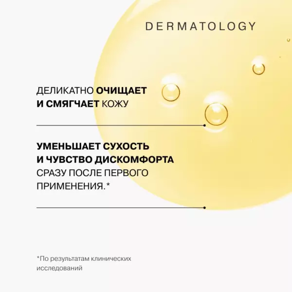 Деликатно очищает и смягчает кожу. Уменьшает сухость и чувство дискомфорта сразу после первого применения