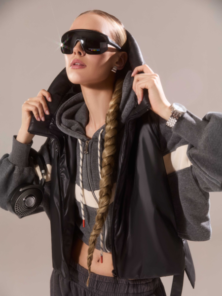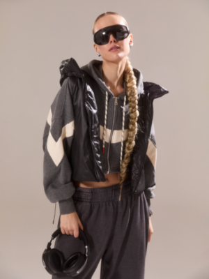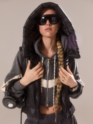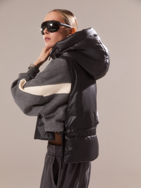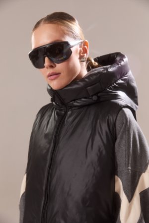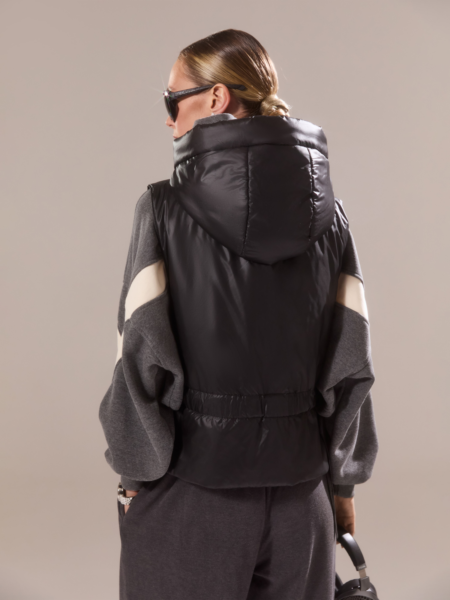 Жилет из глянцевой ткани на тонком утеплении на молнии с втачным капюшоном. Ткань на мембране. По талии есть функциональная утяжка на шнур из основной ткани. Капюшон на утяжке.