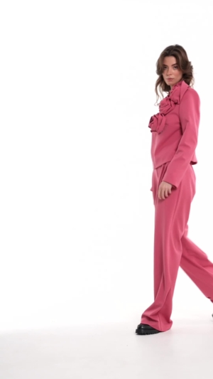 Костюм состоит из жакета и брюк. Укороченный жакет на подкладе прямого кроя с застёжкой на металлическую молнию. Декорируется пришивными текстильными цветами. Брюки прямые от бедра с защипами по переду и боковыми карманами. Застёжка в виде гульфика с молнией и двух пуговиц по поясу.