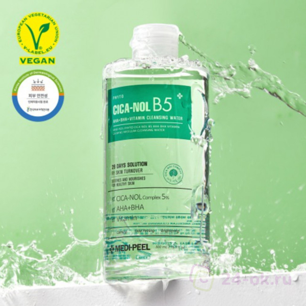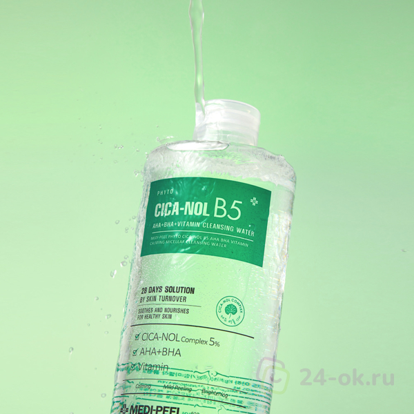 Успокаивающая мицеллярная вода Medi-Peel Phyto Cica-Nol B5 AHA BHA Vitamin Calming Cleansing Water глубоко очищает, удаляет даже стойкий макияж, тональные и солнцезащитные средства. Проникает в поры, растворяет комедоны и излишки кожного сала, помогает осветлить чёрные точки и сальные нити.