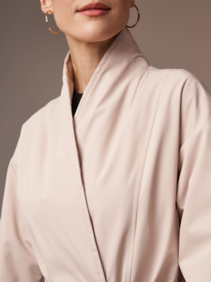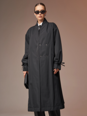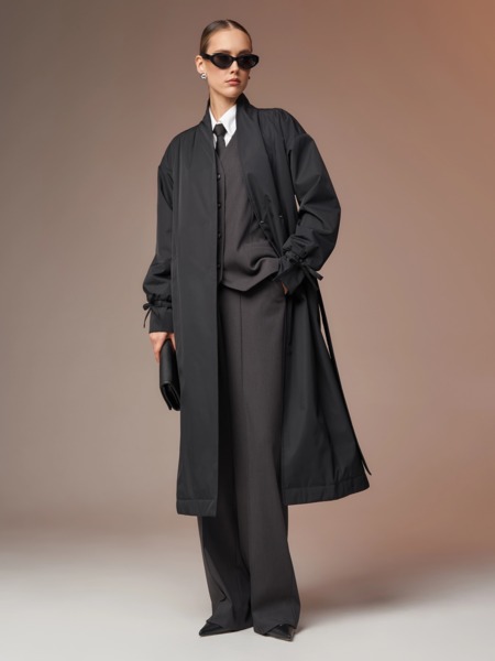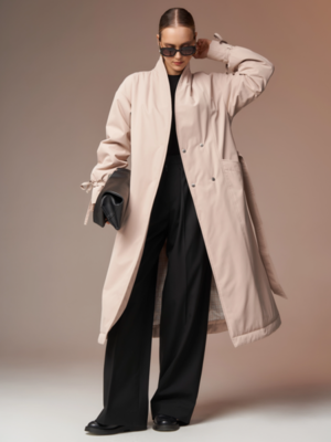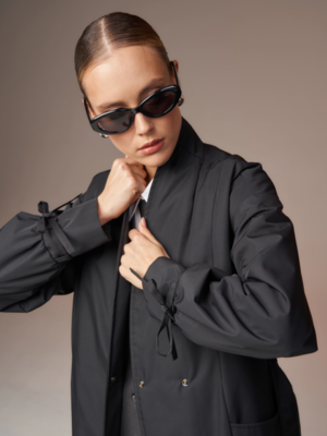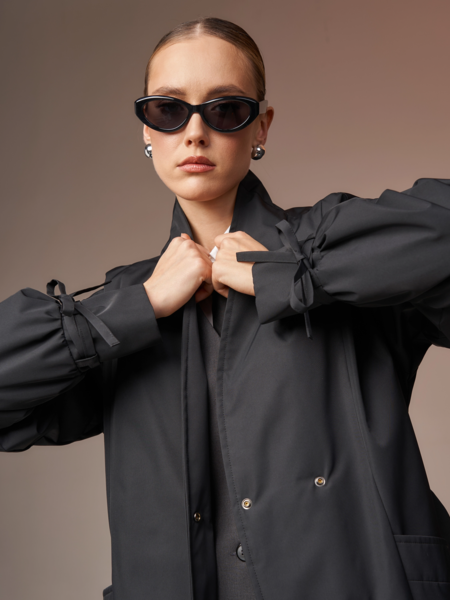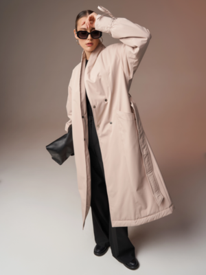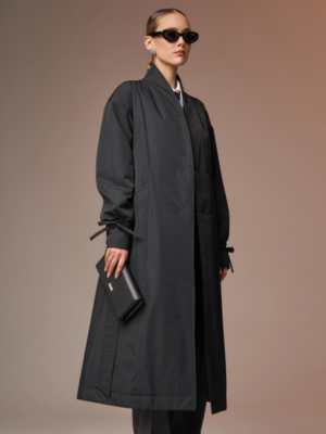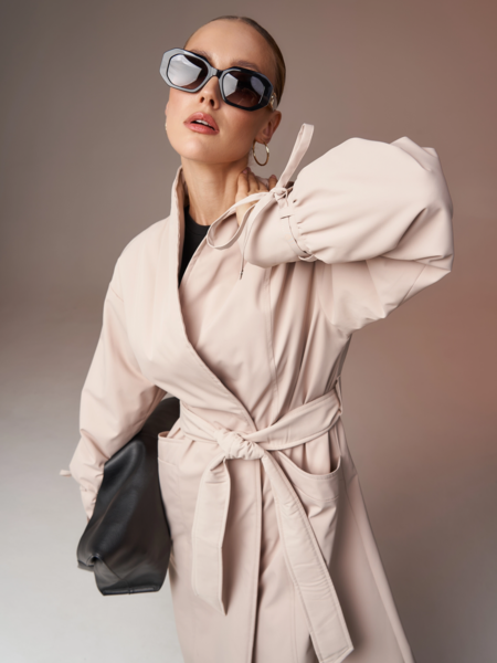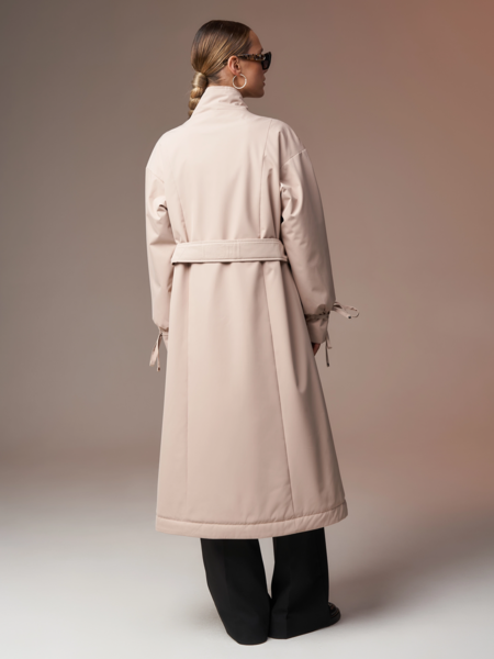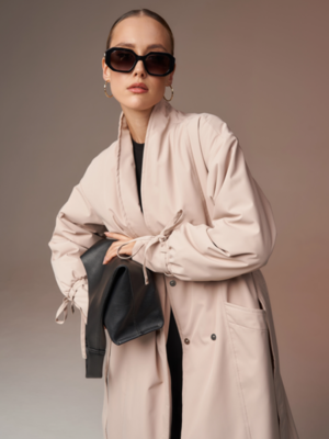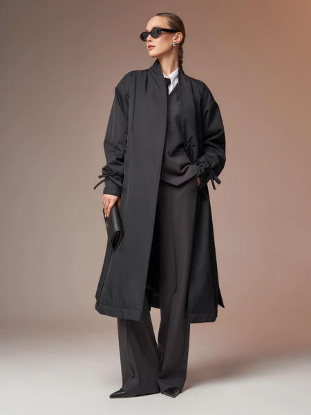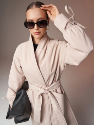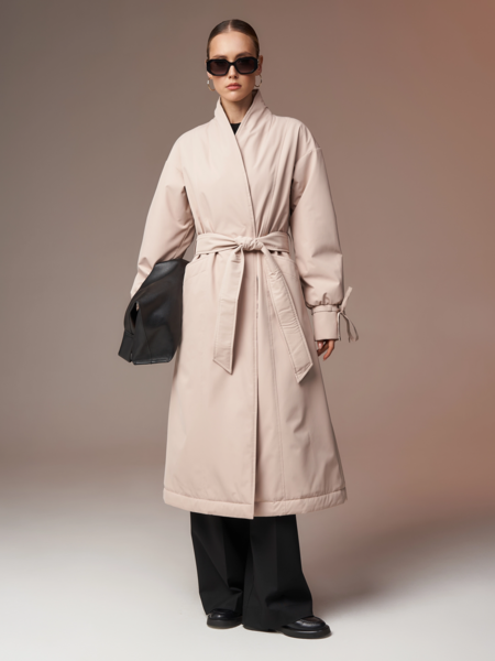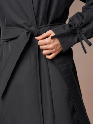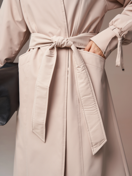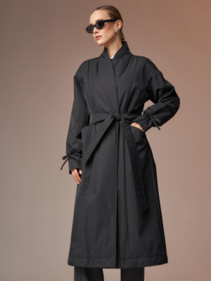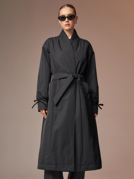 Застежка на потайные кнопки. Низ рукава собран на манжету с декоративной завязкой. Воротник оформлен в стиле кимоно. Ткань с водоотталкивающей пропиткой и мембраной. В комплекте пояс из основной ткани.