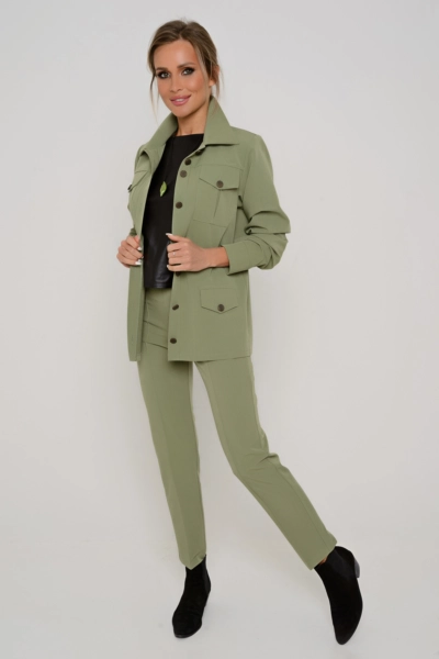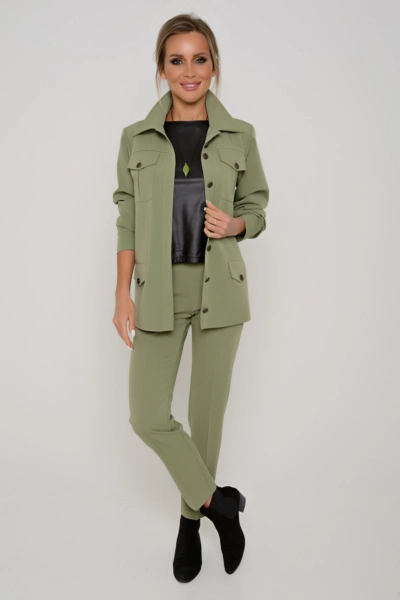 На уровне бедер - прорезные карманы с листочкой, перекрытые клапанами с заострёнными углами и отделочными пуговицами.
