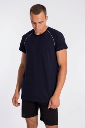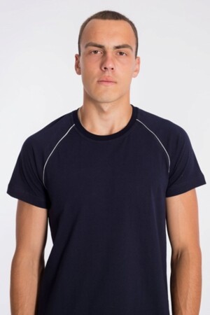 Мужская футболка выполнена из хлопкового полотна. Горловина имеет круглый вырез, рукава покроя реглан отделаны кантом.