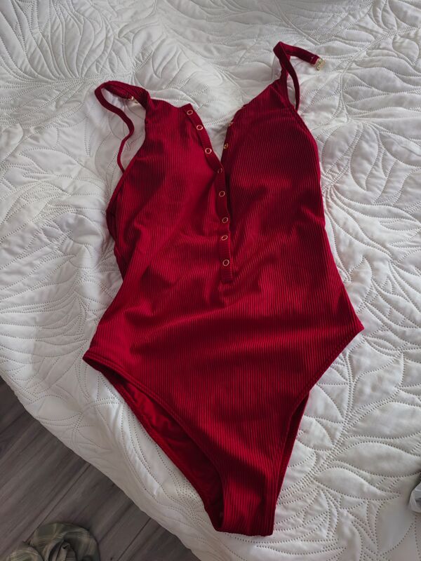 Артикул Trendyolmilla Kırmızı Halter Yaka Aksesuarlı Dokulu Çırçıtlı Brazilian Mayo TBESS25MA00093