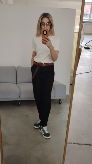 | Лаконичные брюки со стрелками в черном цвете. Выполнены из плотной костюмной ткани на основе вискозы, дышащей и приятной к телу.Средняя посадка ниже талии. Модель комфортно, слегка свободно садится в области бедер,чуть заужена к низу.Сочетайте с жакетом из нашей коллекции. Длина брюк с поясом по боковому шву 105 см. Полуобхват по поясу 39 см ( р42), 41 см (р44), 43 см ( р46), 45 см ( р 48). Полуобхват по бедрам 46.5 см ( р42), 48.5 см (р44), 50.5 см ( р46), 52.5 см ( р48). | |||||||||||||||||||||||