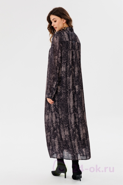 Платье выполнено из креп-атласа с принтом. Платье рубашечного силуэта, длиной миди. Застежка спереди на пуговицы. На спинке кокетка и встречная складка от нее. Воротник стояче-отложной с отрезной стойкой. Рукав втачной, одношовный, с прорезью по низу. Низ рукава на манжете, застегивающейся на пуговицы. В боковых швах карманы. Платье декорировано нашивками по спинке. Платье на отлетной по низу подкладке. Ремень в комплект входит.
