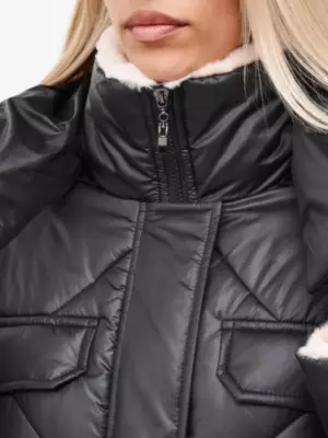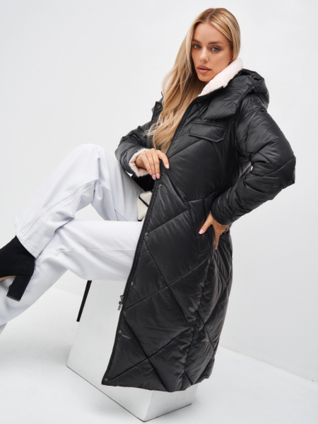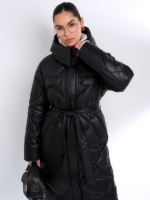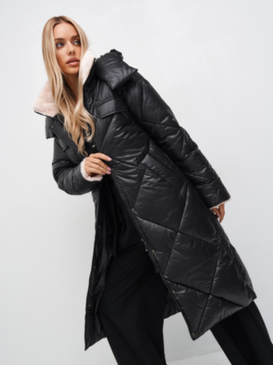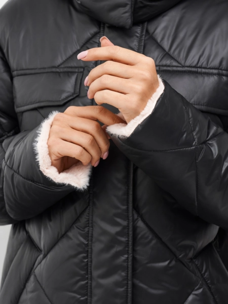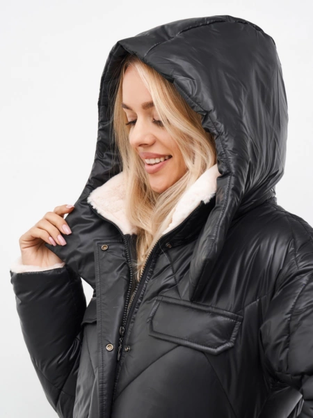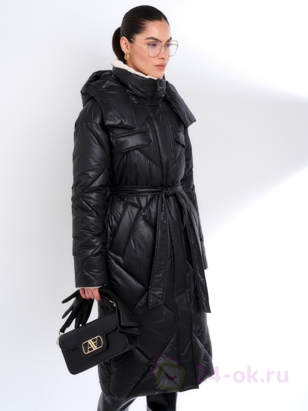 - Детали: отстежной капюшон, воротник- стойка и обтачка рукава обработаны мехом, застежка на потайные кнопки и молнию, в комплекте пояс из основной ткани.