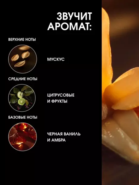 Глубокий, тёплый и обволакивающий аромат, вдохновлённый нишевым Зелински Блэк Ванила. Амбра придаёт композиции густоту и благородство, а ваниль — мягкость и уют. Вместе они создают атмосферу интимного, дорогого шлейфа, который будто остаётся в воздухе после объятий.