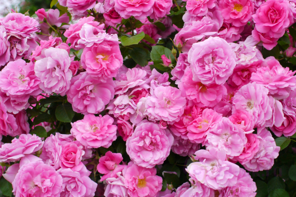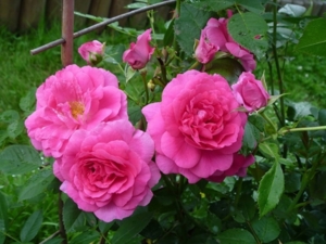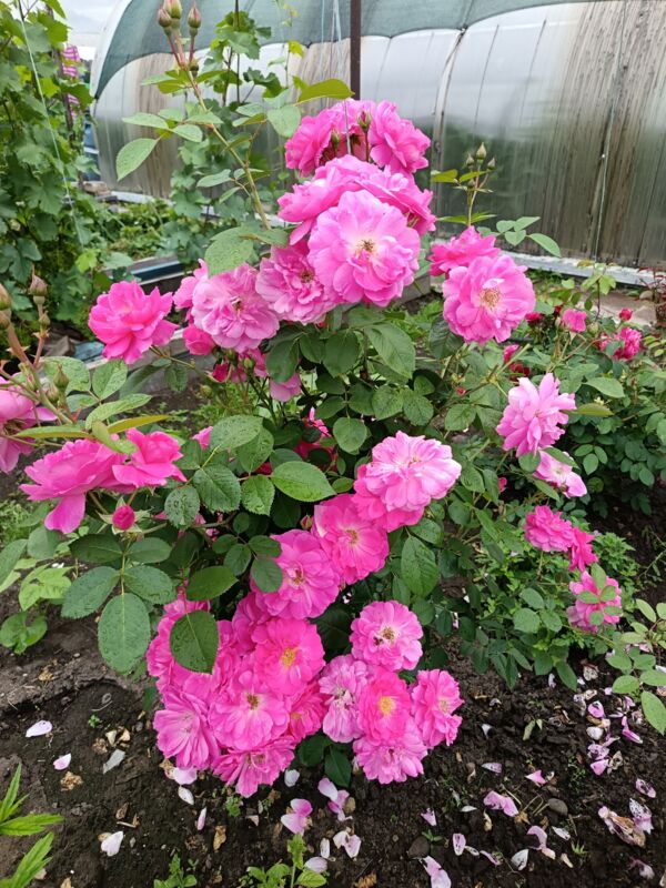 Цветки бледно-малиновые, выгорают до ярко-розовых, махровые. Появляются по одному или в кистях до 15 шт (обычно 3-7), затем следуют красивые красные плоды. Первое цветение очень обильное, но на растении всегда присутствует пара цветков до следующего обильного цветения осенью. Обрезка отцветающих цветков стимулирует появление новых. Листва темная, блестящая, здоровая (хотя иногда возможна черная пятнистость), куст сильно рослый. Обрезка заставляет розу ветвиться и увеличивает количество цветков.