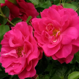 Цветки раскрываются из малиновых бутонов. Они красные, позднее выгорают до темно-розовых. Появляются по одному или в небольших кистях (до 7 шт), затем появляются красивые красные плоды. Джордж Ванкувер – компактный и прямостоячий куст, хотя в жарком климате вырастает раскидистым и неаккуратным. Листва темная, блестящая, практически не подвержена грибным заболеваниям в холодных регионах, однако болеет черной пятнистостью в мягком климате.