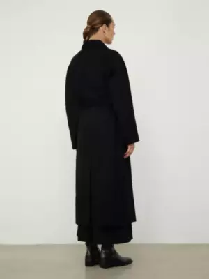 Восхитительное длинное пальто чёрного цвета из натуральной шерсти элегантно завершит любой образ. Приталенная модель дополнена поясом. Имеет некрупный английский воротник и вместительные карманы по бокам.