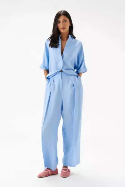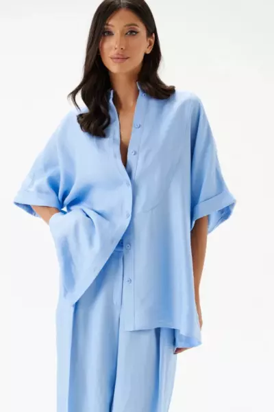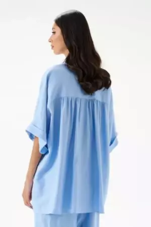 Состав: 83 вис 17 лен Описание: Рубашка свободного кроя. Выполнена из вискозно-льняной ткани голубого цвета. Воротник отложной, на стойке. Рукав цельнокроеный с манжетой. По переду фигурная кокетка. Спинка на кокетке со сборкой. Застёжка центральная – пуговички. Длина рукава от стойки воротника 43 см. Длина спинки 69 см. Рубашку дополнят брюки А1513