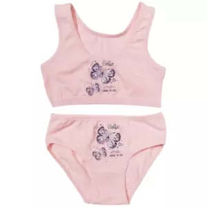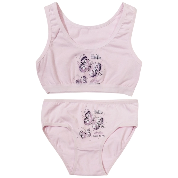 Комплект белья для девочек, состоящий из топа и трусиков. Выполнен из трикотажного полотна - кулирка (100% хлопок). Комплект декорирован принтом "Бабочки".