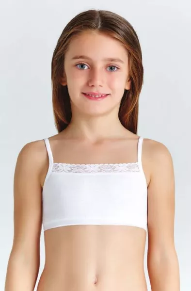 Топ для девочки, белого цвета, из эластичного х/б трикотажа. Тонкие бретели. Вырез спереди отделан эластичным кружевом. Бретели, пройма и вырез спинки из эластичной атласной резинки. Под грудью эластичная резинка с атласным кантом.