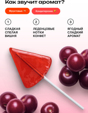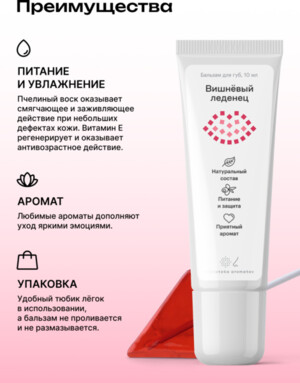 Сложно придумать более подходящий аромат для бальзама для губ, чем «Вишнёвый леденец». Так сочно, так сладко. Оторваться невозможно.