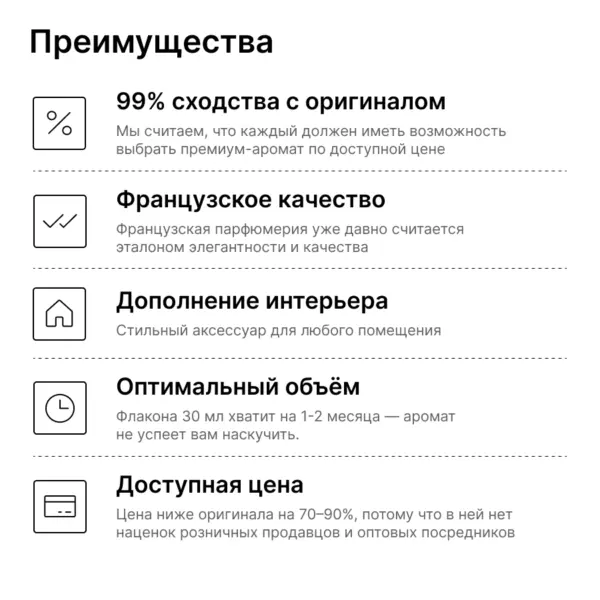 Новый бренд, вдохновлённый люксовой парфюмерией. Мы считаем, что у каждого должна быть возможность приобрести премиум-аромат по доступной цене.