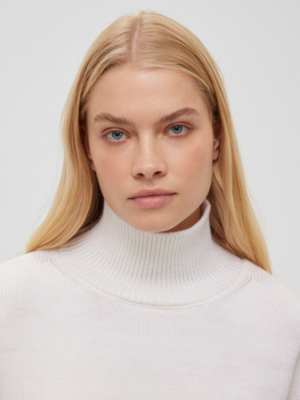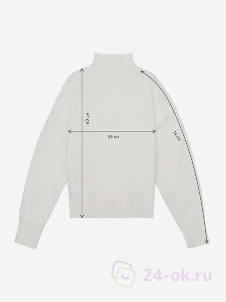 Свитер свободного кроя со спущенным плечом, воротником-стойкой, резинкой на рукавах и по низу изделия.