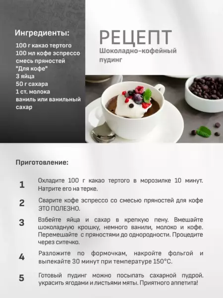 Шоколадно-кофейный пудинг: охладите 100 г какао тертого POLEZZNO в морозилке 10 минут. Натрите его на терке. Сварите 10 мл кофе эспрессо со смесью пряностей для кофе POLEZZNO. Взбейте 3 яйца и 50 г сахара в крепкую пену. Вмешайте в нее шоколадную крошку, немного ванили или ванильного сахара, стакан молока, 100 мл кофе эспрессо с пряностями до однородности. Процедите через ситечко. Разложите по формочкам, накройте фольгой и выпекайте 30 мин при температуре 150 °C. Готовый пудинг можно посыпать сахарной пудрой, украсить ягодами и листьями мяты.