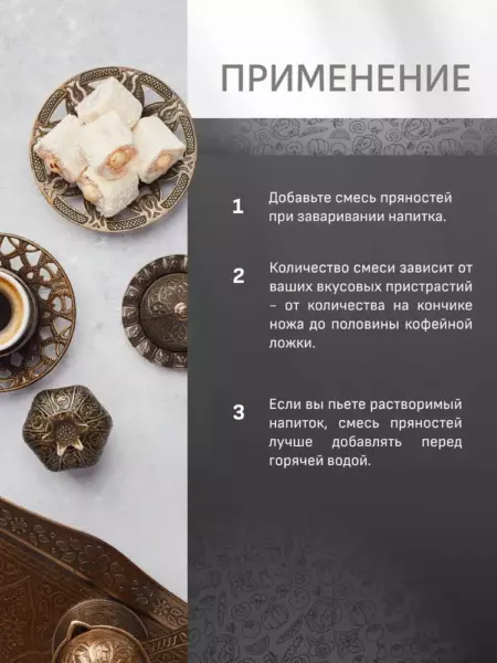 Если выпьете растворимый напиток, смесь пряностей лучше добавлять перед горячей водой. Смесь можно использовать и для ароматизации кофейных, шоколадных и иных десертов, компотов и желе.