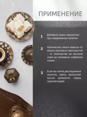 Восточный букет пряностей во главе с корицей и кардамоном. Для добавления в кофе и не только. Прекрасно сочетается с выпечкой и десертами.