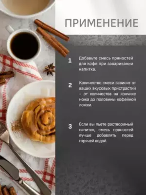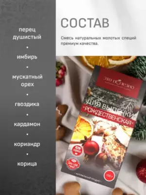 Состав Молотые специи: перец душистый, имбирь, мускатный орех, гвоздика, кардамон, кориандр, корица