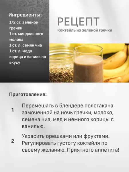 Перемешайте в блендере полстакана замоченной на ночь гречки, 1 стакан миндального молока, 1 ст.ложку семян чиа, 1 ст. ложку меда или сиропа агавы, немного корицы и ванили. Украсьте орешками или фруктами. Регулируйте густоту коктейля по своему желанию. - Зеленая гречка с овощами.